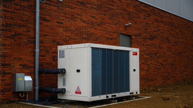 The Belaria fit (53) heat pump is installed outside the Hall Sportif de la Bruyère.