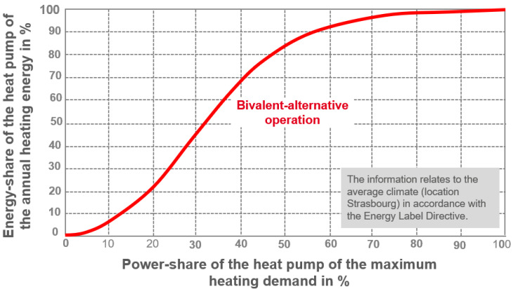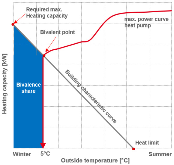 The bivalence range on the left with the building characteristic curve showing the relationship between heat pump output and outdoor temperature.