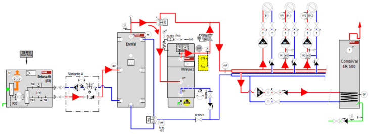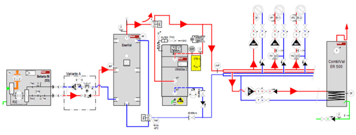 The total heated area of the Hall Sportif de la Bruyère amounts to 2136 m2, with the heat diffused via water-based air heaters and radiators. In addition to heating the sports hall, the heating system also has to heat water for a total of 22 showers. The design temperature of the heat distribution system is 60°C. A minimum outdoor temperature of -9°C was taken as a basis for the system, resulting in a calculated heat load of 99 kW for the sports and multi-purpose hall.