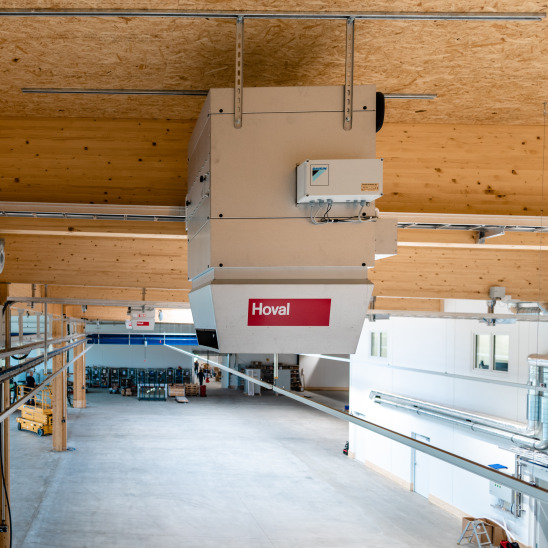 In the course of building the new production facility, the decision was taken to choose a modular solution from Hoval, which combines all three requirements – heating, cooling and ventilation of the hall – in one system. Since September 2019, two RoofVent and twelve TopVent units, each in combination with a heat pump, have been providing fresh air and comfortable temperatures in the 8,500 m2 hall.